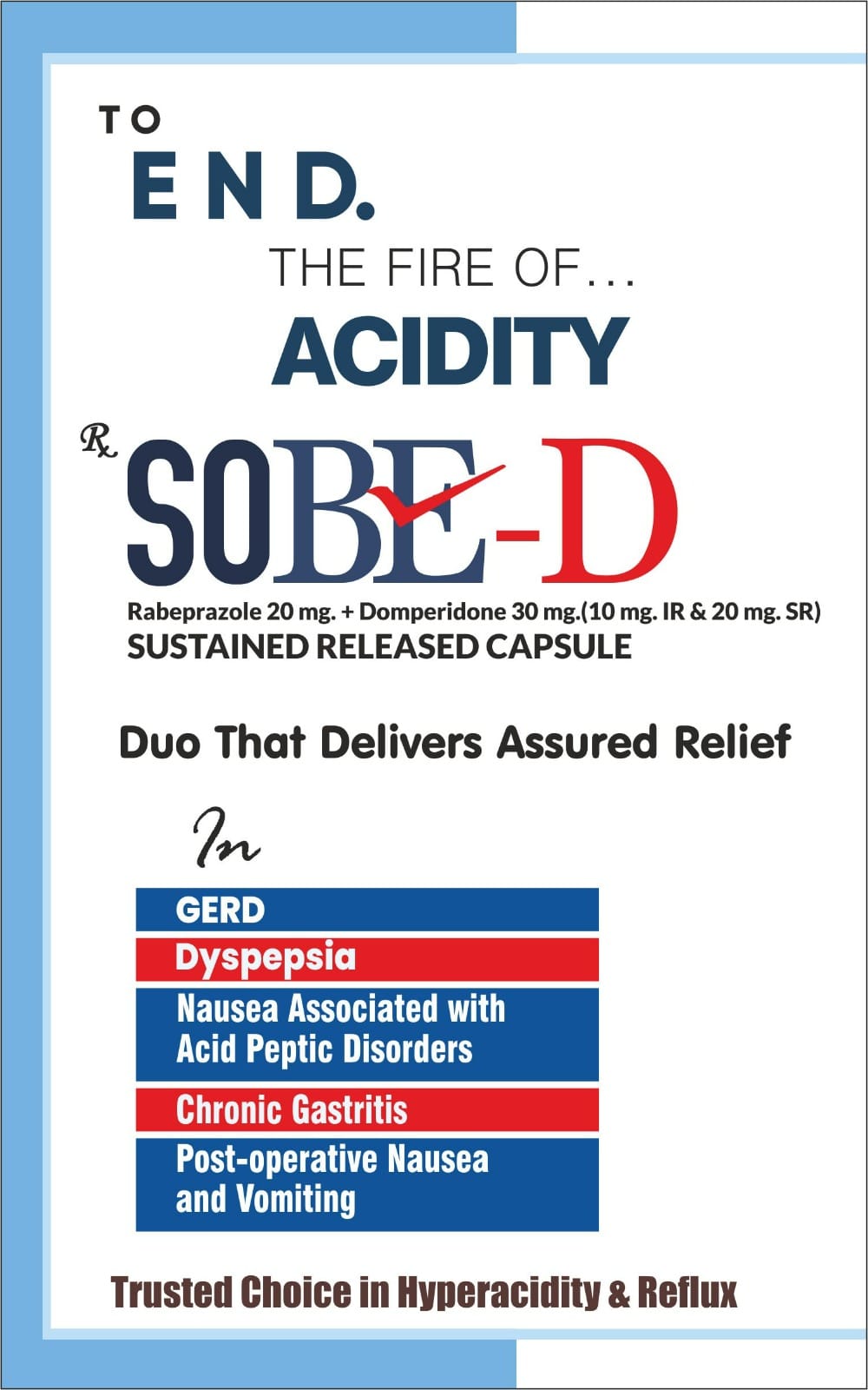 Gastroesophageal reflux disease (GERD) is a chronic (long-term) condition in which there is an excess production of acid in the stomach. Sobe-D Capsule SR reduces the amount of acid your stomach makes and relieves the pain associated with heartburn and acid reflux. You should take it exactly as it is prescribed for it to be effective. Some simple lifestyle changes can help reduce the symptoms of GERD. Think about what foods trigger heartburn and try to avoid them; eat smaller, more frequent meals; try to lose weight if you are overweight, and try to find ways to relax. Do not eat within 3-4 hours of going to bed.