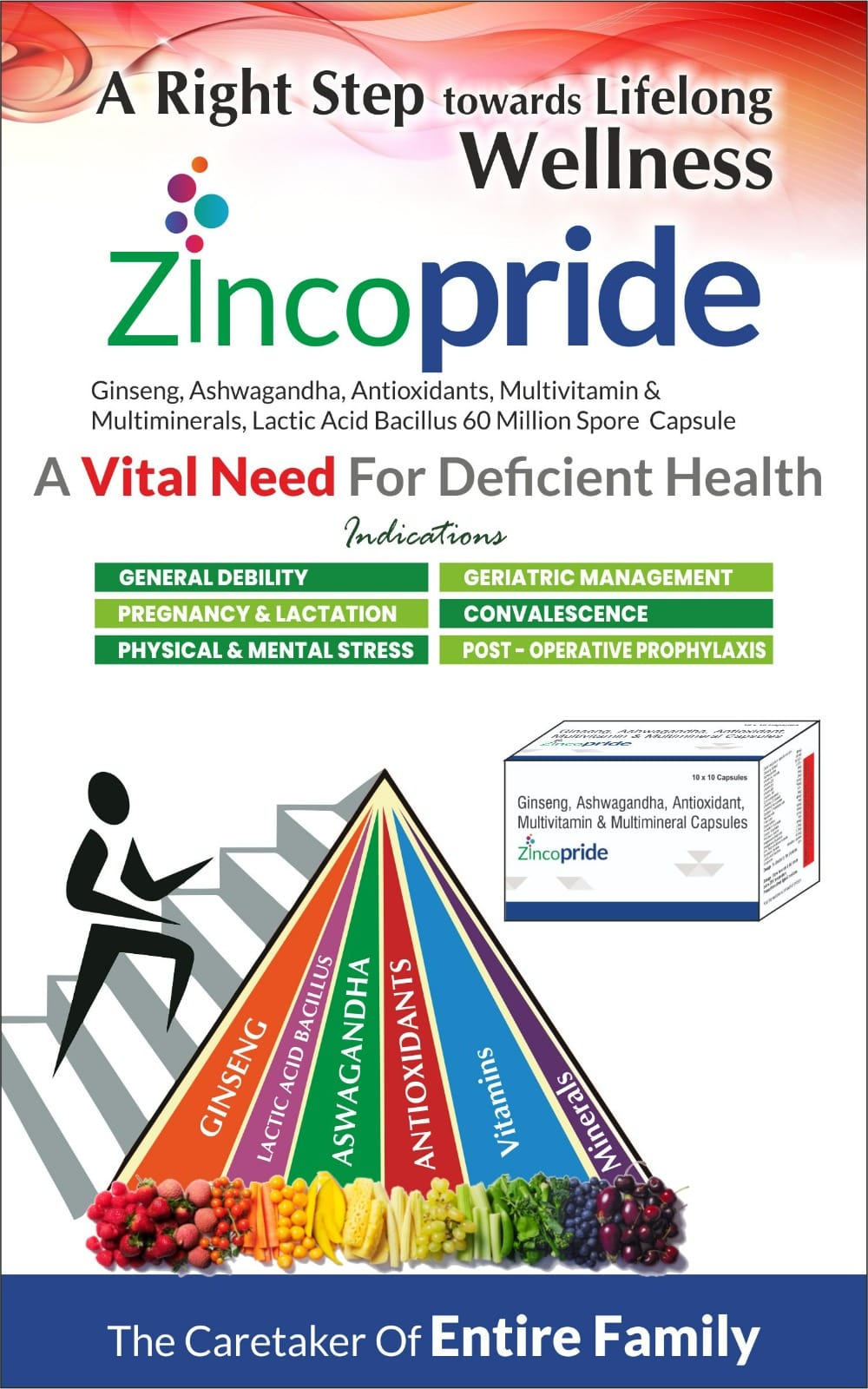 • Ginseng supports mental clarity and physical endurance, Ashwagandha supports immune function, Vitamins and minerals provide essential nutrition, Zincopride supports immune function, bone health, cellular processes, and vitality, Zincopride contains antioxidants that help protect cells from oxidative stress